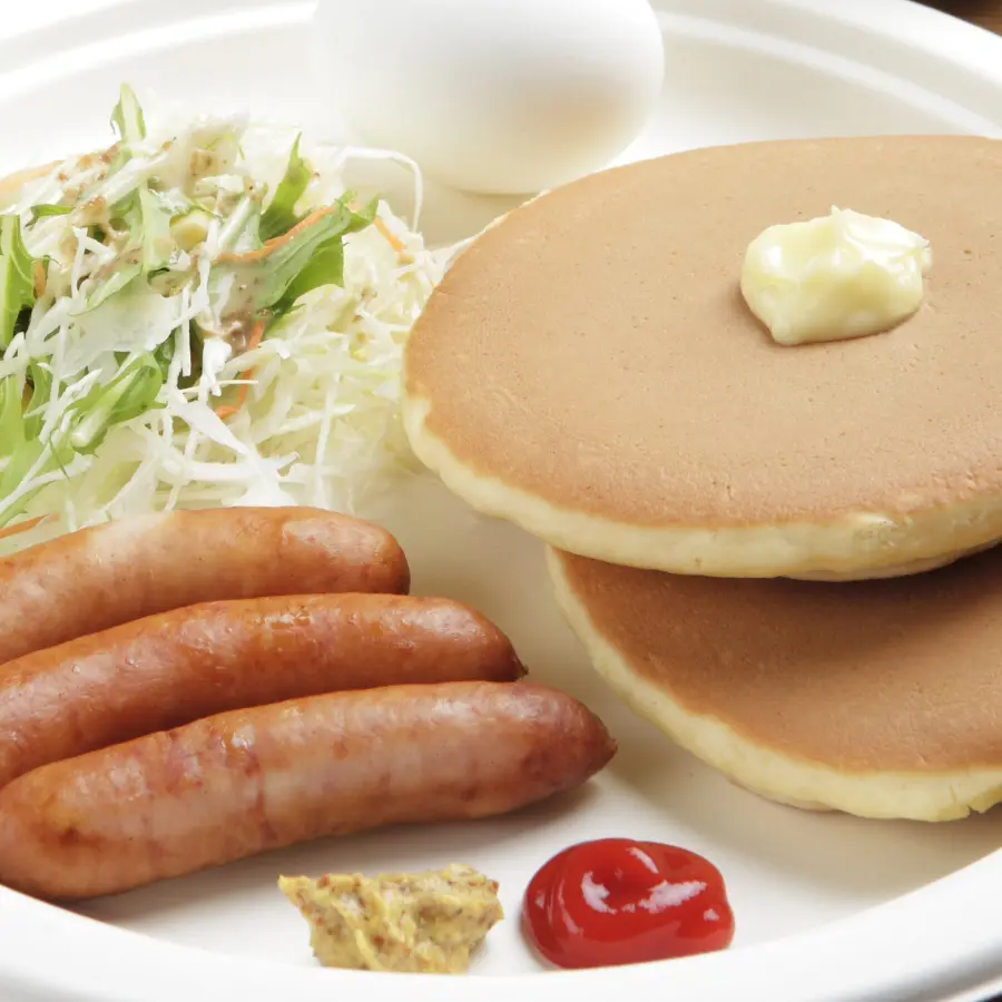 メイン:ごはん / 味噌汁 / 魚 / 漬物 / 海苔 / パンケーキ / トースト / サラダ など